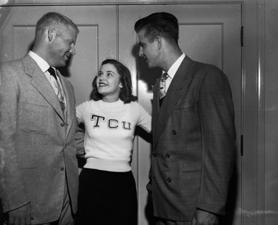 Texas Christian University (TCU) Sweetheart Susanna Landers had a hearty Fort Worth greeting for Dave Hanner, left, and Travis Simpson, powerful Arkansas tackles. Published in the Fort Worth Star - Telegram evening edition, October 7, 1950.