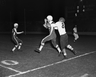 Bob Cross (dark jersey) of Arkansas knocks down a first-quarter pass intended for Billy Moorman of Texas Christian University in the game at TCU Stadium. Published in Fort Worth Star-Telegram morning edition October 9, 1950.