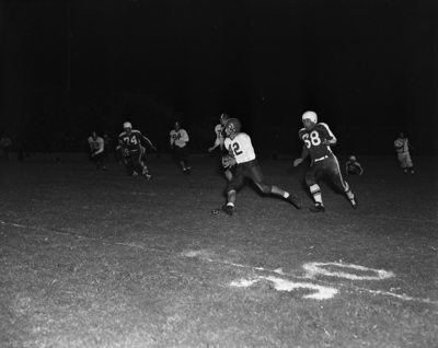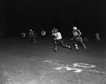 Dan Wilde, Texas Christian University halfback, races along toward a 29-yard punt return in the second quarter of the game against Arkansas, unaware that Don Riederer, Razorback guard, is striving mightily to overtake him. Wilde escaped, but was tackled by another Razorback on the Arkansas 29-yard line. Published in Fort Worth Star-Telegram morning edition October 8, 1950.