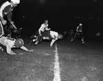 Gilbert Bartosh of the Frogs balances on one hand, preparatory to a crash landing in second period against Arkansas. Running beside him is Dick Lowe. The play gained eight yards. Published in Fort Worth Star-Telegram morning edition October 9, 1950.
