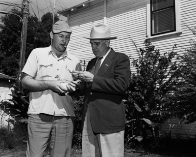 Thomas L. Yates, right, campaign chairman for the Fort Worth Community Chest, unrolls message taken from the leg of a pigeon held by its owner, Joe Rowland of 1108 Eilac Lane. The message was from W. Crawford Fullilove, president of the Caddo- Bossier Community Chest, wishing Fort Worth success in its drive. Published in the Fort Worth Star - Telegram morning edition, October 9, 1950.