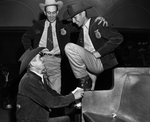 Before boarding a special train at Fort Worth to their national convention in Kansas City, Texas Future Farmers of America engaged in a bit of play at the Union Station. Kenneth Gregg, Plainview, left, polished the shoes of the state president, Weldon Mason, Meadow, while Wilbur Dunk, Junction, looks on. Gregg and Dunk are voting delegates. Published in the Fort Worth Star - Telegram morning edition, October 9, 1950.