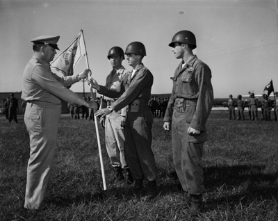 Brigade General John W. Naylor, left, presents training prize to Sergeant First Class Amos Beard, 1100 E. Ripy, and Second Lieutenant William G. Miller, 213 Wyatt, right, platoon sergeant and commander of honor platoon in ceremony at Eagle Mountain Lake. Published in the Fort Worth Star - Telegram morning edition, October 9, 1950.