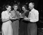 Four former residents of Justin Dig into their dinner at the sixth annual Justin Club picnic at Forest park. The Justinites are, left to right, Mrs. E. S. Mulkey, Mrs. Lenn Barnard, Mrs. H. L. White and Jay Pafford. All lived in Fort Worth. Published in the Fort Worth Star - Telegram morning edition, October 9, 1950.