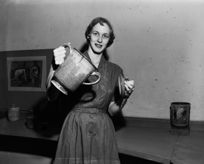 Mrs. L. R. Klein Jr., Fort Worth Art Association secretary, is shown with a pottery jar from the exhibition of Pond Farm Workshop crafts, which opened in the association gallery at the Public Library. Published in the Fort Worth Star - Telegram morning edition, October 10, 1950.