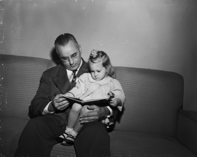 While Mrs. Franta was out shopping, Albert Franta of Highlands, near Baytown, kept daughter Rosalyn, 2 and half, amused at the Texas Automotive Dealers Association convention. Published in the Fort Worth Star - Telegram evening edition, October 9, 1950.