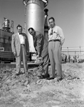 Turning the first spadeful of dirt for construction of a $750,000 platforming unit at the Fort Worth plant of Premier Oil Refining Company of Texas is R. P. Hargis, Longview, president of the firm. Watching are L. G. Dufilho, left, Longview, general superintendent of refining operations, and Lawrence Connellery, right, superintendent of the Fort Worth plant. Published in Fort Worth Star-Telegram evening edition, October 10, 1950. Three men dressed formally. A man in center is digging a shovel in the ground.