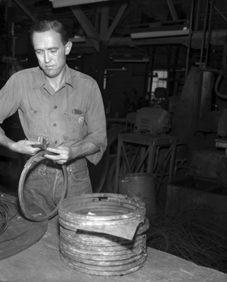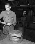 Frank Burrows, 35, whose vision is more than 98 percent gone, wants no part of the blind man who stands on a street corner with a tin cup. A man looking down at something he is holding. Published in Fort Worth Star-Telegram evening edition, October 11, 1950.