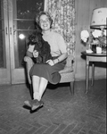 Pro golfer Helen Detweiler of Indio, California, relaxes after winning first match, over Pat Garner, 4-3 at the Texas Women's Open. She is sitting with her dog, smiling. Published in Fort Worth Star-Telegram morning edition, October 11, 1950.