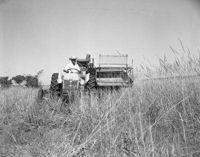 Art Dillon has had good success combining native grass on his Erath County farm and believes that grass propagation can mean saving the life of Central Texas soil. Here he is harvesting Indian grass seed. Published in Fort Worth Star-Telegram January 1951.