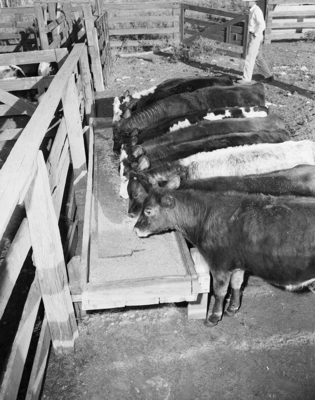 Cattle feeding is an important factor in Dillon's farm program. These are some of the calves he had on mother cows in the fall. Published in Fort Worth Star-Telegram January 1951.