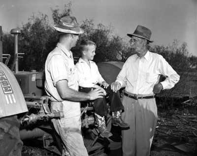 Image shows from left to right, Ed Newquist Jr. ,son, Don Newquist . grandson and Ed Newquist Sr. beside a tractor. Ed Newquist Sr, is one of the original founders of Ericksdahl community. Published in the Fort Worth Star-Telegram , November 5, 1950.
