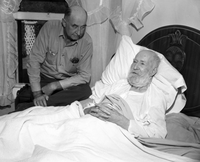Image shows A. M. G. Swenson, left, assistant manager of the Swenson Land and Cattle Company and A. J. Swenson, right, in bed, vice president and former manager of the Swenson Land and Cattle Company. Published in the Fort Worth Star-Telegram , November 5, 1950.