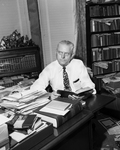 Image shows Reverend Hugo B. Haterius, pastor of Ericksdahl Lutheran Church, in his office, seated at desk, in Ericksdahl. Published in the Fort Worth Star-Telegram , November 5, 1950.