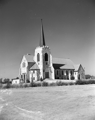 Image shows an exterior shot of Bethel Evangelical Lutheran Church at Ericksdahl near Stamford. The construction begun before World War II and was completed at the end of the war. Published in the Fort Worth Star-Telegram , November 5, 1950.