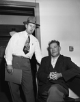 Wray F. Ware, 54, seated in photo at left, tells Detective John Dunwoody that his victim tried to break up his home. A two men one is standing up and the other man is sitting down. They are both wearing suits. Published in Fort Worth Star-Telegram morning edition, October 11, 1950.