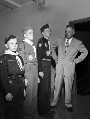 Ardell Young, right, gave his approval in an inspection of these Boy Scouts who were among several hundred who participated in a "Strengthen Liberty Crusade" program at Polytechnic High School. The boys, left to right are Cub Stephen Haile of Pack 107; Boy Scout Don Stripling of Troop 3, and Explorer Cecil Alexander of Post 3. Young gave the patriotic address to 18 scout units and parents attending the ceremonies. A man in a suit and three teenage boys in uniforms. Published in Fort Worth Star-Telegram evening edition, October 11, 1950.