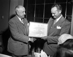 Chamber of Commerce dinner for Aviation Executives. Left to right, L. C. Elliott, Joseph J. O'Connell, Washington, Amon Carter, A. B. Curry, Miami, Florida, D. W. Rentzel, Washington, Phillips Moore, Washington, and Colonel Frank Williamson. Phillips Moore is awarding Amon Carter with a certificate of Airports Advisory Committee.