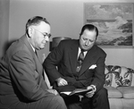 C. P. Simpson, right, of Houston, newly elected president of the Texas Automobile Dealers Association, will have the aid of E. A. Kinsel, Beaumont, new third vice president, in shaping the association's plans and policies in the coming year. Two men wearing suits looking at a document. Published in Fort Worth Star-Telegram morning edition, October 11, 1950.