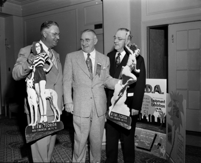 Nothing wrong with these body models, conventioning auto dealers decided. Inspecting bathing beauty cut-outs boosting a Miami convention next year are left to right, C. R. Johnson of Sweetwater, George H. Jones of Corpus Christi and Ernest Walker of Texarkana. Three men wearing suits and two men are holding cardboard women in front of them. Published in Fort Worth Star-Telegram evening edition, October 10, 1950.