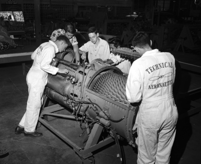 Five Technical High School students who are majoring in aircraft mechanics learn about jet engine construction from a cutaway instructional model. Clockwise around the engine are Mardis Fabor (in coveralls, back to camera) Phillip Haught, Richard Pruitt, Paul Mallon and George Gomez. Published in Fort Worth Star-Telegram morning edition, October 15, 1950.