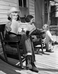 Image shows H. O. Kelly seated on front porch with his wife, Mrs. Kelly and family pet dog. He is inspecting western paintings from Tom Lea. Published in the Fort Worth Star-Telegram , November 5, 1950.