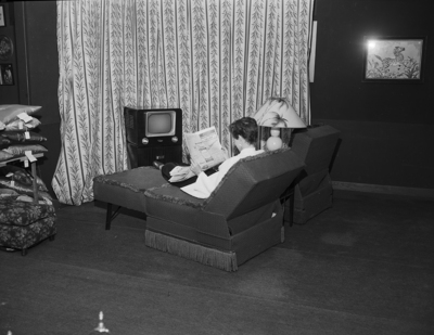 A newly developed versatile piece of furniture finally is arriving in Fort Worth in quantity, E. L. Childers, furniture department manager at Leonard's Department Store, announced after having made a hit at the recent Chicago Furniture Mart exhibition. Called the "all-purpose TeVe chair-bed", the chaise longue-type items particularly adaptable for televiewers, as shown here. Published in Fort Worth Star-Telegram evening edition, October 11, 1950.