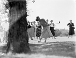 Alice Bauer, unable to take full swing because of trees (left), sends approach shot toward number 14 green at River Crest. She lost the hole but outlasted favored Dot Kielty, 1 up in championship flight. Published in Fort Worth Star-Telegram morning edition, October 12, 1950.