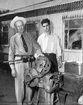 Ed Edgin, left, veteran brass foundryman, and his son, Olin, display a rusted, heavy chuck from the lathe of their shop at 2712 West Sixth Street, ruined by Fort Worth flood in May 1949. Edgin is talking to his friends, hoping to help put over the $7,000,000 flood control bond issue on October 27. Published in Fort Worth Star-Telegram evening edition, October 12, 1950.