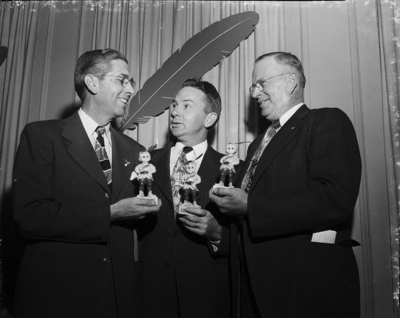 Three Community Chest campaign captains whose teams went over the top on 1951 fund quotas at the first report meeting of the employee division proudly display Red Feather Oscars. Left to right, L. H. Johnson, telegraph and telephone captain; Dick Curry, Convair captain, and Walter W. Craig, state employee's captain. Published in Fort Worth Star-Telegram morning edition, October 12, 1950. Three men wearing tuxedos and corsages on the tuxedos.