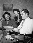 Mrs. Earl L. Williams, 1618 New York, center, looks at pictures of Mr. and Mrs. Aulton A. Aulger's self-termed "wheelchair-living-home" in San Diego. The Aulger's are visiting Mr. and Mrs. Williams. Published in Fort Worth Star-Telegram morning edition, October 12, 1950. A man and two women looking at a piece of paper.