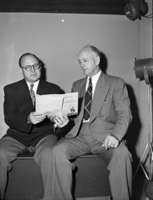 A. B. Hann, left, and Colonel Walter Linn, in charge of arrangements for the Baptist General Convention of Texas, discuss some of the many problems facing them. Published in Fort Worth Star-Telegram morning edition, October 15, 1950.