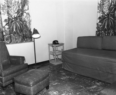 Red rubber tile flooring, forest green upholstery, a private shower, cold drink machine, studio couch and lounging chairs are provided in the doctors' lounge in the OB ward at Saint Joseph's. The wing recently has been entirely re-designed, equipped and decorated by Mrs. Burton Carter and her daughter, Mrs. J. Lee Johnson III. Published in Fort Worth Star-Telegram morning edition, October 15, 1950.