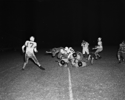 Van Williams, Arlington Heights fullback, rams over from one-yard line with touchdown in second quarter against Carter Riverside Eagles that tied score at 6-6. D. K. Robinson (51) of Carter is too late to stop the score. Robinson is the son of Mr. and Mrs. D. K. and Gladys Robinson. Arlington Heights went on to win game, 34-6. Published in Fort Worth Star-Telegram evening edition October 13, 1950.
