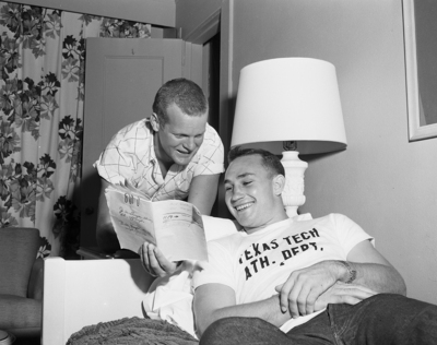 Visiting football players relax in a Fort Worth hotel prior to contests. At left, Bobby Broyles, Texas Tech defensive captain and guard form San Angelo, left, scans notes with J. W. Thompson, offense captain and fullback from Odessa. Tech plays Texas Christian University. Published in Fort Worth Star-Telegram morning edition October 14, 1950.