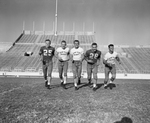 These five backs, shown during a light workout in Fort Worth, will carry the mail for Texas Tech against Texas Christian University. Left to right are Earl Jackson, Pete Edwards, Tim Hatch, J. W. Thompson and Ike Stuver. If Jackson's injuries handicap him to severely, Thompson with be a starter. Published in Fort Worth Star-Telegram morning edition October 14, 1950.