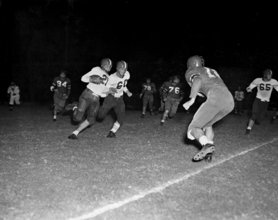John Harville, former Paschal ace, picks up 10 yards for Texas Christian University in second quarter of the game against Texas Tech. Guard Alton Taylor (60) leads the way. TCU won, 19-6. Published in Fort Worth Star-Telegram morning edition October 16, 1950.