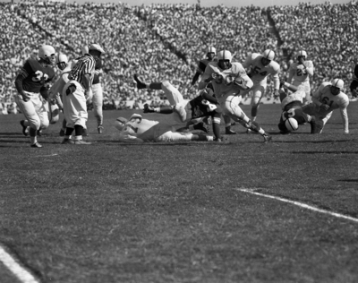 Byron Townsend, Texas fullback, heads for the goal as two Longhorn blockers clear his path on a 15-yard scoring play in the second quarter at the Cotton Bowl. The Sooners being blocked are Tom Catlin (54) and Dean Smith (51). The Longhorns doing the blocking are Gene Vykukal (79) and Lewis "Bud" McFadin (61). Published in Fort Worth Star-Telegram morning October 15, 1950.