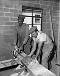 Roy Bland, left, and H. H. Stewart, members of Carpenters Union, worked with an electric saw in ripping some of the lumber that was used in casing doors at the Good Will House, 915 Broadus. Published in Fort Worth Star-Telegram morning edition, October 15, 1950.