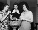 Misses Esther Osborn, left, president; Mary Catherine O'Connor, vice president, and Gladys Scott, right, treasurer, assisted at Our Lady of Victory homecoming in the reception hall for high school and college alumnae. Published in Fort Worth Star-Telegram morning edition, October 16, 1950.