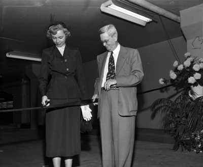 Miss Patricia Ann Glenn, Fort Worth National Bank employee, snips tape to open the bank's new seven-level parking garage at 711 Commerce. W. M. Massie, senior vice president of the bank, looks on at right. The garage will provide free 45-minute parking for bank customers. Published in Fort Worth Star-Telegram morning edition, October 16, 1950.