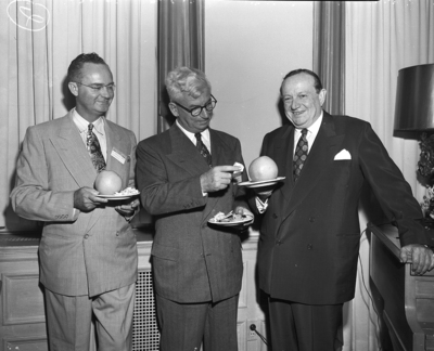 A. B. Curry of Miami, Florida, center, chairman of the Airports Advisory Committee of the CAA, looks over some "typical" Texas oranges at a reception for committee members and guests at the Fort Worth Club. At left is Phillips Moore, director of airports, CAA, Washington, and at right is Sid W. Richardson of Fort Worth. Published in Fort Worth Star-Telegram morning edition, October 16, 1950.