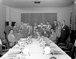Members of the Airports Advisory Committee of the Civil Aeronautics Administration and other aviation leaders at the opening of a Committee meeting. Seated left to right is: G. D. Albrecht, John Berry of Cleveland, Amon Carter, Donald W. Nyrop, A. B. Curry of Miami, and John N. Lavin. Standing behind them from left to right is: W. M. Robertson, E. S. Hensley, Don W. Martin, Robert Cook, Louis R. Inwood, Walter E. Betsworth, Arthur C. Hyde, R. W. F. Schmidt, Hervey F. Law, and C. F. Horne.