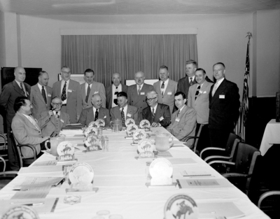Members of the Airports Advisory Committee of the Civil Aeronautics Administration and other aviation leaders at the opening of a committee meeting. Seated left to right are: G. D. Albrecht, John Berry of Cleveland, Amon Carter, Donald W. Nyrop, A. B. Curry of Miami, and John N. Lavin. Standing behind them from left to right is: W. M. Robertson, E. S. Hensley, Don W. Martin, Robert Cook, Louis R. Inwood, Walter E. Betsworth, Arthur C. Hyde, R. W. F. Schmidt, Hervey F. Law, and C. F. Horne. The men are at the opposite side of the room from the photographer. They are behind a large dining table decorated with rounded name plates with the inscription "Fort Worth, where the West begins." The men are all wearing suits and ties.