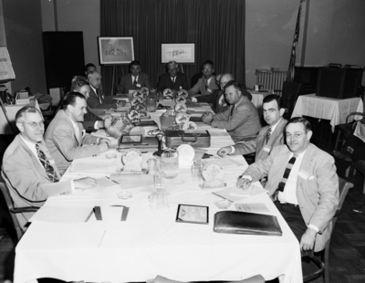 Grouped around a conference table at Hotel Texas are members of the Airports Advisory Committee of the Civil Aeronautics Administration. Seated from left to right are: Don W. Martin, G. D. Albrecht, John H. Burke, John Berry, Amon Carter, Robert Cook, Donald W. Nyrop, A. B. Curry, Phillip Moore, Louis R. Inwood, Walter E. Betsworth, Arthur C. Hyde, John N. Lavin, and Hervey F. Law.