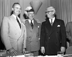 Amon Carter (center) received his commission as an admiral in the Nebraska Navy from Civil Aeronautics Administrator Donald W. Nyrop (not pictured) at a dinner for members of the Civil Aeronautics Administration Airports Advisory Committee at Hotel Texas in Fort Worth.