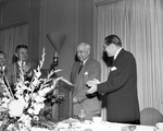 Airports Advisory Committee. Amon Carter receives from Civil Aeronautics Administrator Donald W. Nyrop (to Carter's right) his commission as an admiral in the Nebraska Navy at a dinner for members of the Civil Aeronautics Administration Airports Advisory Committee at Hotel Texas. Amon Carter, center, standing behind a podium at a dinner for members of the committee.