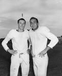 Guy Thompson, left, of Kaufman and Bernard (Corky) Brown of Dallas will open at ends for Texas Christian University freshman football team against the Texas A&M freshmen at TCU Stadium. Published in Fort Worth Star-Telegram morning edition Oct 17, 1950.