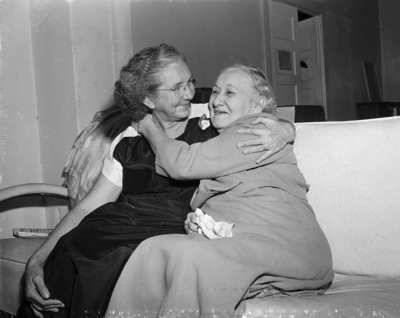 Mrs. Clara Stacy, 55, of San Antonio, left, was joyfully reunited with her mother, Mrs. Caroline Peacock of 612 South Adams, whom she had not seen for 50 years. Published in Fort Worth Star-Telegram morning edition, October 17, 1950.