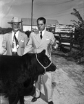 Alfredo Fortabat of Argentina, right, who runs 12,000 Angus cattle on his 300,000-acre ranch was impressed with this 17-month-old heifer which Luther McClung, president of the Texas Aberdeen Angus Association, showed him at his Saginaw ranch. Published in Fort Worth Star-Telegram morning edition, October 17, 1950.
